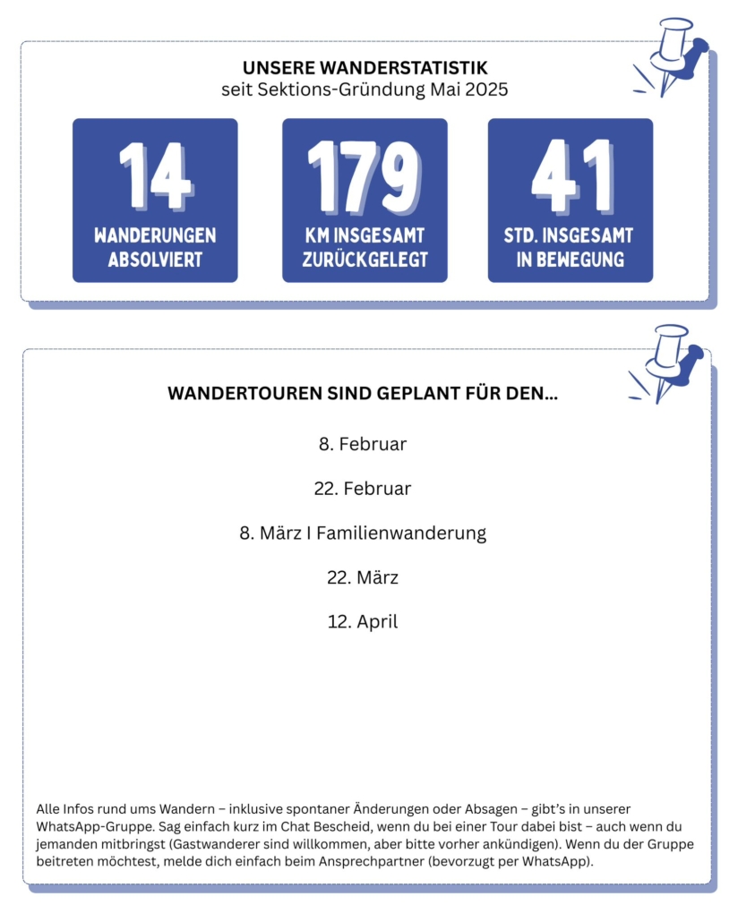 - Infos zur nächsten Tour: Alle Details (Route, Uhrzeit, Treffpunkt etc.) werden im WhatsApp-Gruppenchat bis spätestens Mittwochabend vor dem Wanderwochenende bekannt gegeben.